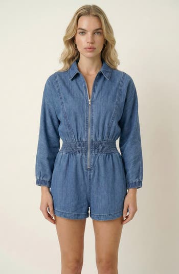 Crafted in a soft denim-inspired fabric, this zip front romper offers a flattering and comfortable silhouette with its smocked waistband and 3/4 elastic cuff sleeves. The structured collar adds a hint of utility style, while the subtle wash and streamlined shape make it a versatile staple for casual daywear or effortless weekend outings.