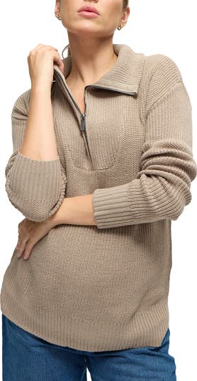 Move through your pregnancy in ultimate comfort in this ribbed quarter-zip sweater featuring a relaxed fit to accommodate your growing belly.