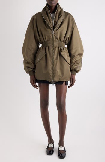 Givenchy elevates the classic bomber to couture heights with this longline iteration where bold design meets meticulous craftsmanship. A sculpted double-shawl collar accented with sharp silvertone zippers creates a striking focal point that commands attention, while roomy dropped shoulders anfd bias-cut seams enhance the architectural silhouette. Imagined in resilient polyamide, this piece is as daring as it is enduring.