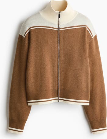 Short cardigan in a fine knit containing some wool. Ribbed stand-up collar, zip down the front and dropped shoulders. Ribbing at the cuffs and hem.