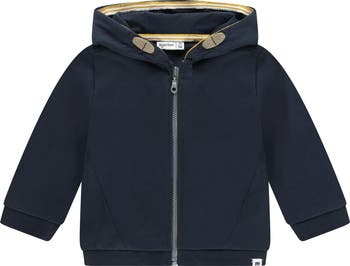 This navy-toned zip up sweatshirt features asymmetrical seamed accents, a hoodie, and zip enclosure.