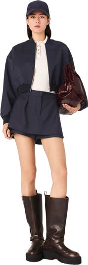 Inspired by an Italian spring between Milan and Lake Como, the collection explores clean lines and comfortable materials.In a chic nautical spirit, this jacket reinterprets the classic bomber with a contemporary touch. Its cropped cut structures the silhouette, while the elasticated waist and ribbed finishes enhance comfort.Wear with the matching skirt for a complete look, a ribbed polo, zipped boots and a signature cap for a metropolitan, assertive style.