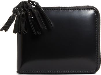 A medley of leather-tasseled zipper handles collectively comprises the single pull on this plump wallet crafted from brand-stamped calfskin with a well-organized interior.