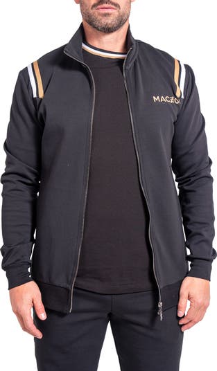 A cotton-blend knit made with a touch of enhanced stretch brings easy-moving comfort to a track jacket that's perfect for layering over or into your cool-weather wardrobe. Topped with a taller collar for extended coverage, it features pops of striped ribbing to keep you looking sporty in any activity.