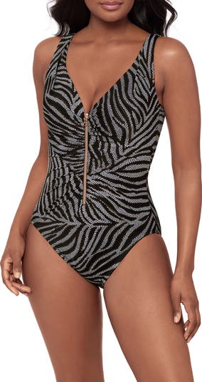 Signature Miratex® fabric lends all-over shaping support to this zip-front one-piece swimsuit made with shirred side seams.