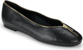 A goldtone zipper trims the collar and adds an edgy aesthetic to a streamlined leather flat featuring a cushioned footbed and flexible rubber sole.