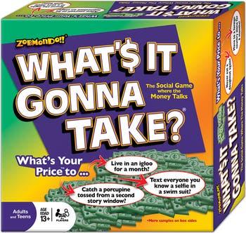- TEEN & ADULT BOARD GAMES: When choosing adult games for game night, you'll love What's It Gonna Take?, the game where every outrageous proposition--"would you kiss a boa constrictor?"-- has a price.,