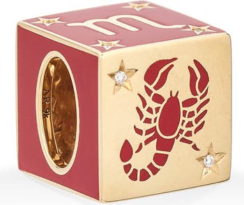 Hand-set diamonds and enameled accents adorn this distinctive cube bead featuring the zodiac symbols.