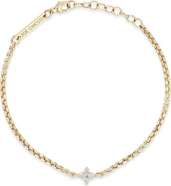 This 14-karat-gold bracelet features a box chain centered with four prong-set diamonds.
