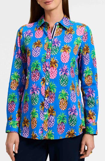 Brightly hued pineapples pop against the blue background of this cotton button-up shirt finished with striped contrast under the placket and cuffs.