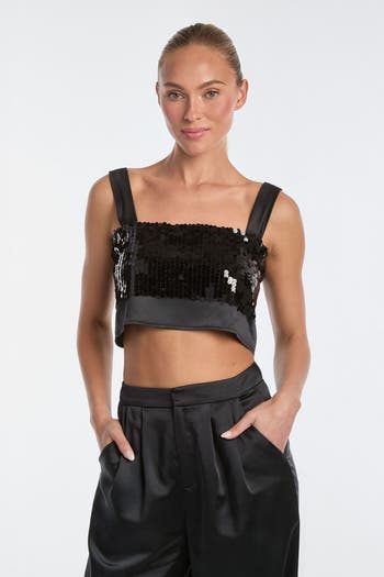 Make any evening an occasion in the Zoey Sequin Crop. This dazzling piece features stunning satin overlaid with sequin embellishment, a square neck, and two hook-and