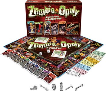 Zombie-opoly allows players to buy favorite zombies and increase the rent buy buying Boxes of Flesh and trading them in for a Screaming Human. Choose your token and shamble to RRrrrrrr! You may soon be re-animated…or you may just be blood-spewed and bitten.