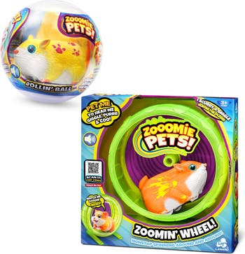 ZOOOMIE PETS: ROLLIN' BALL & ZOOMIN' WHEEL - Do your pets get the zoomies? These Zooomie Pets sure do! PET ME! And hear me giggle, purr, and coo! They zoom, scurry, bump, and bounce off obstacles while making funny sounds, giggles, purring, and cooing that are motion-activated! It’s nonstop Zooomie fun! You can let your Zooomie Pet run wild or place them in the Rollin’ Ball and watch them scurry around inside the clear ball! You can tell your pet is having fun by the sounds it makes. The Zoomin’ Wheel lets your Zooomie Pet get some exercise! Place your Zooomie Pet inside the wheel and watch your pet spin the wheel round and round—it’s nonstop action! Watch me zoom! WEEEE! These adorable, interactive pets are full of personality and designed to keep kids entertained for hours. Each Zooomie Pet moves unpredictably, encouraging children to chase, laugh, and engage in imaginative play as their tiny companion scurries across the floor. The motion-activated sounds make every play session feel lively and unique, adding an extra layer of fun. ZOOOMIE PETS: Cute and zany little hamsters roam around the room, scurrying with cute sounds, and giggling across the floor. BUNDLE INCLUDES: 2 Zooomie Pets - 1 Rollin’ Ball, and 1 Zoomin’ Wheel. Requires 4 AAA / LR03 batteries, not included. Ages 3 and up.