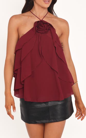 Floaty ruffles add fluttering movement to this flowy chiffon top made with a delicate rosette and framed by cutaway shoulders.