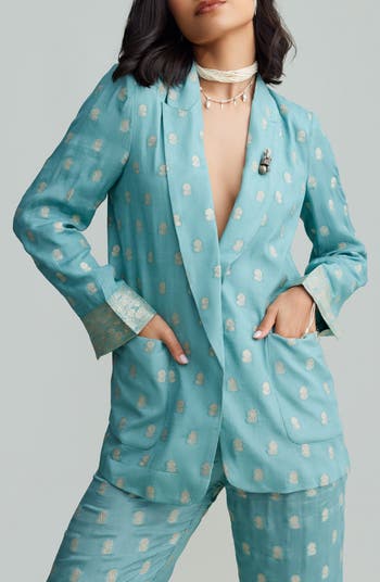 Made from vintage-inspired sarees, this tailored blazer features delicate metallic motifs and roomy patch pockets.