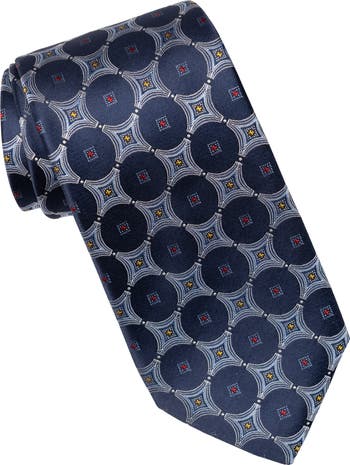 This stunning silk tie boasts an elegant woven circle motif standing out beautifully against the darkest blue background - a shade so deep it shifts between black and navy depending on the light. The faint shimmer in the silk adds an extra touch of sophistication, making this tie a versatile statement piece. It pairs effortlessly with black, navy, grey, and a range of blue jackets, ensuring timeless style for any occasion. Made in Italy