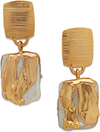 Dripping in a glossy 22k gold and crafted in textured brass with square baroque pearls, these drops channel within them the glorious half-moon at midnight, and are perfect for the day or in the evenings. Zuri Drops are also available in white rhodium plated brass.