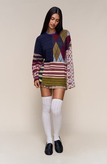 - A cozy patchwork statement knit that reimagines classic patterns through a playful, modern lens