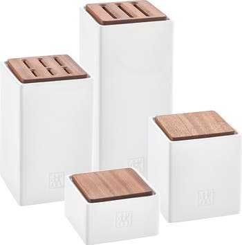 Keep your knives, kitchen tools, herbs and spices safely stored and elegantly displayed in these ceramic storage boxes with wood lids for easy access.