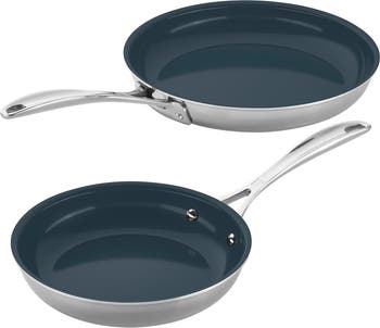 One flip and you’ll be hooked on our latest nonstick. Our ZWILLING(R) Clad CFX line features Ceraforce XTREME ceramic nonstick, a revolutionary coating that is 50% longer lasting and 3x more durable than our previous nonstick. When paired with the even-heating 3mm aluminum core, you’ll enjoy perfectly browned and braised dishes that don’t stick. Chef-friendly features include no-spill pour spouts and comfortable handles that allow for easy maneuvering while wearing oven mitts. All these perks and more make ZWILLING(R) Clad CFX a pleasure to cook with. - 2-piece set - Color: stainless steel - one 8" diameter and one 10" diameter - Imported