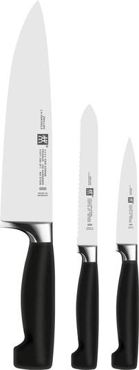 Sizing information: 4" paring knife; 5" serrated utility knife; 8" chef's knife.