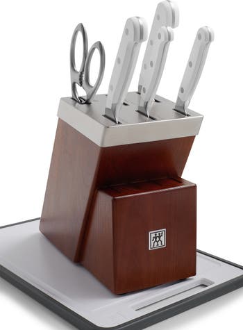 Includes: 4-inch paring knife, 5.5-inch fine-edge prep knife, 8-inch bread knife, 8-inch chef's knife, kitchen shears, cutting board and self-sharpening knife block.